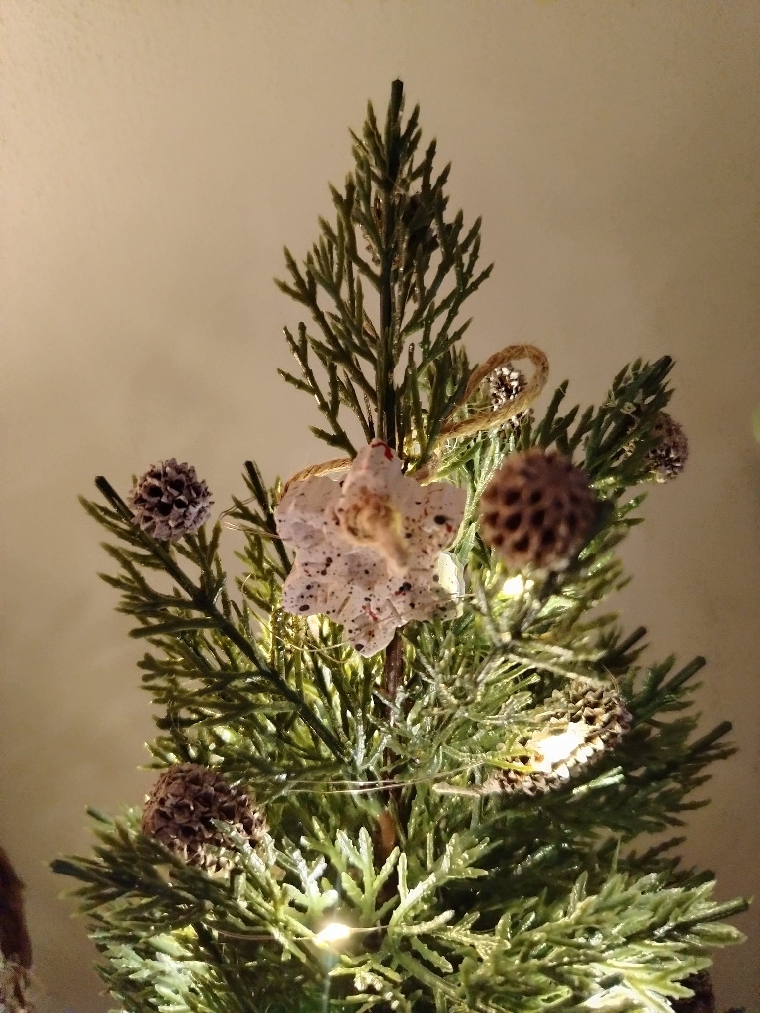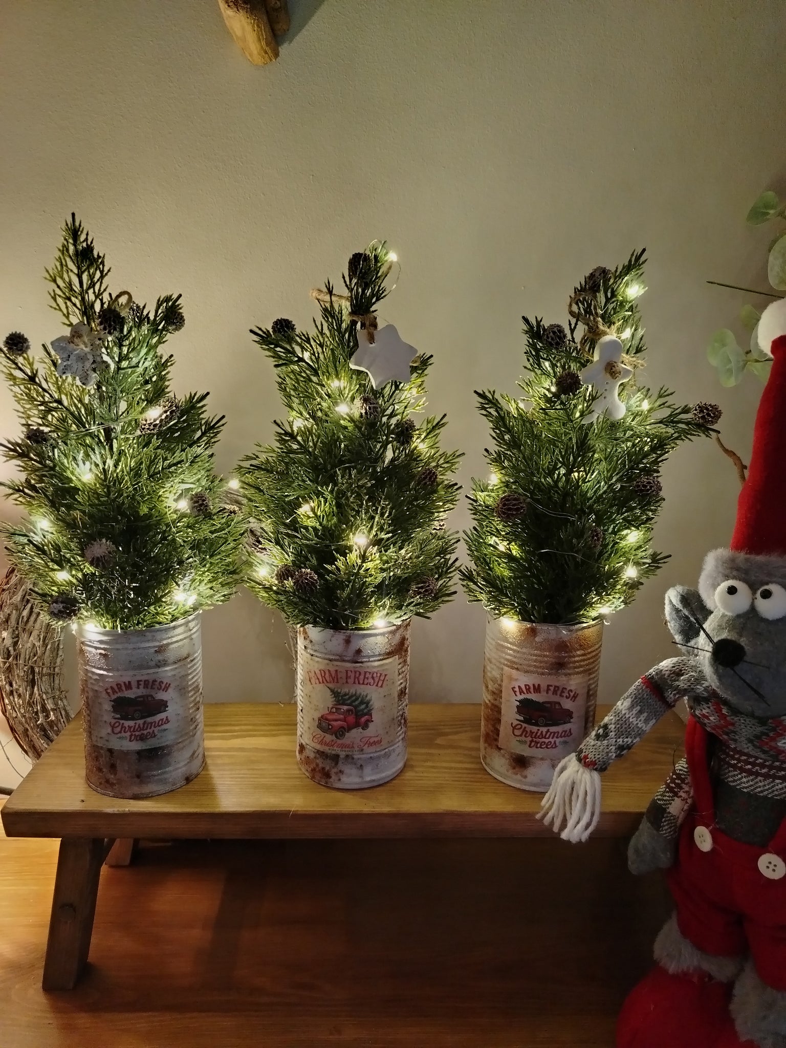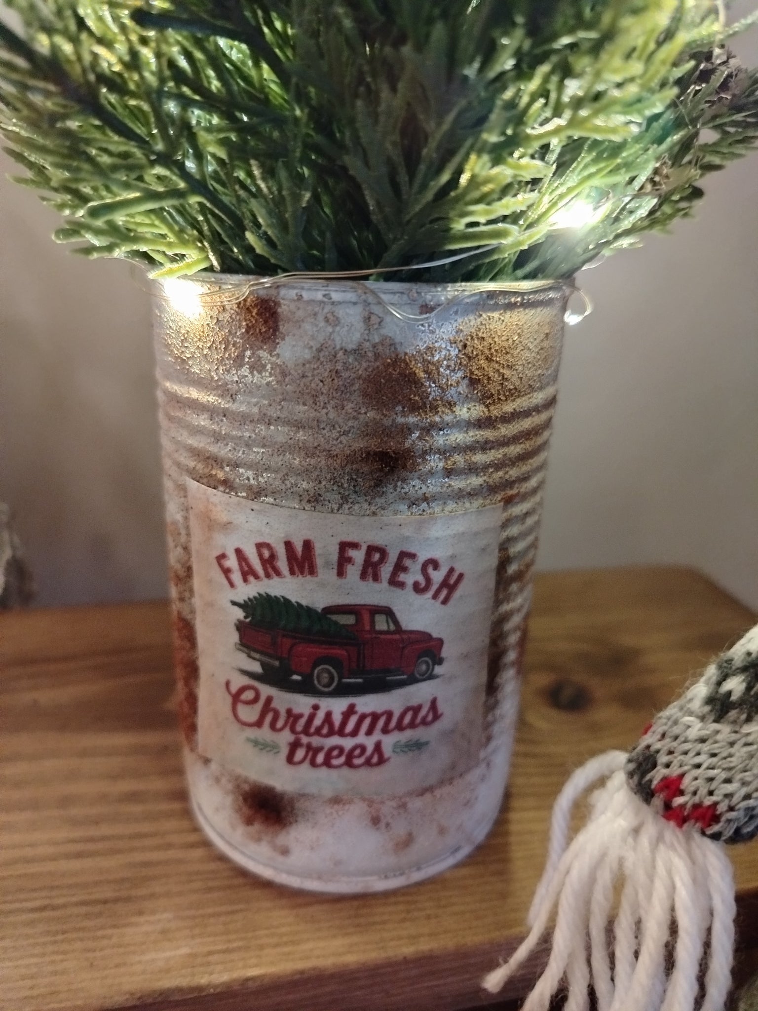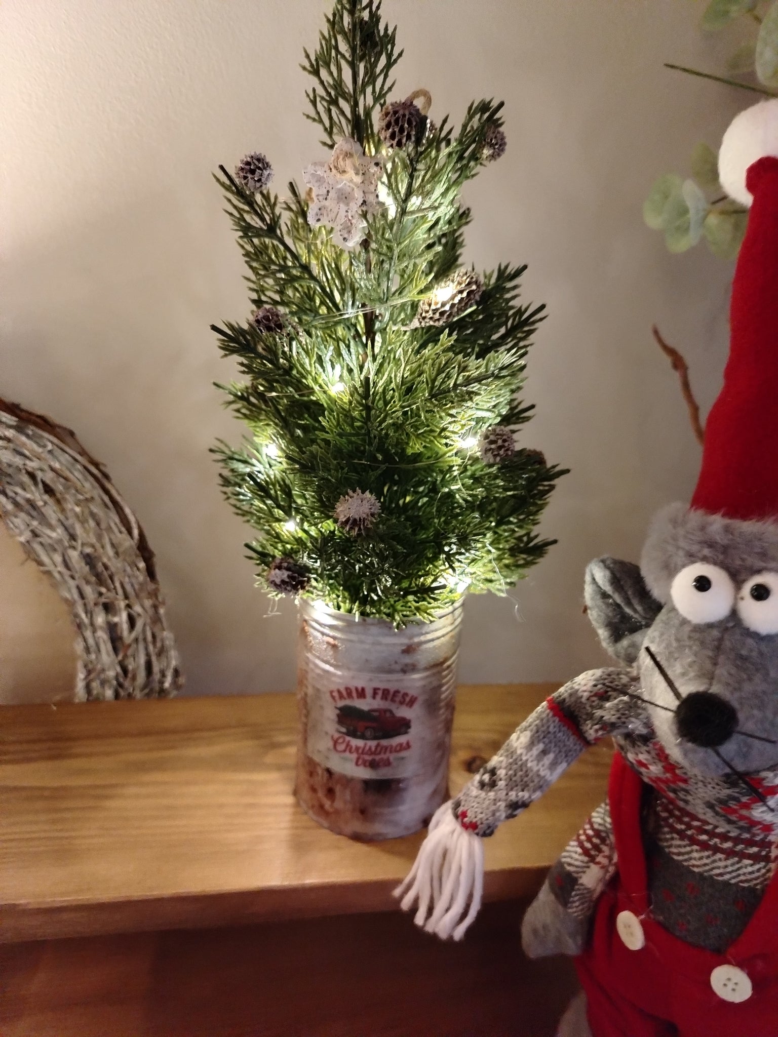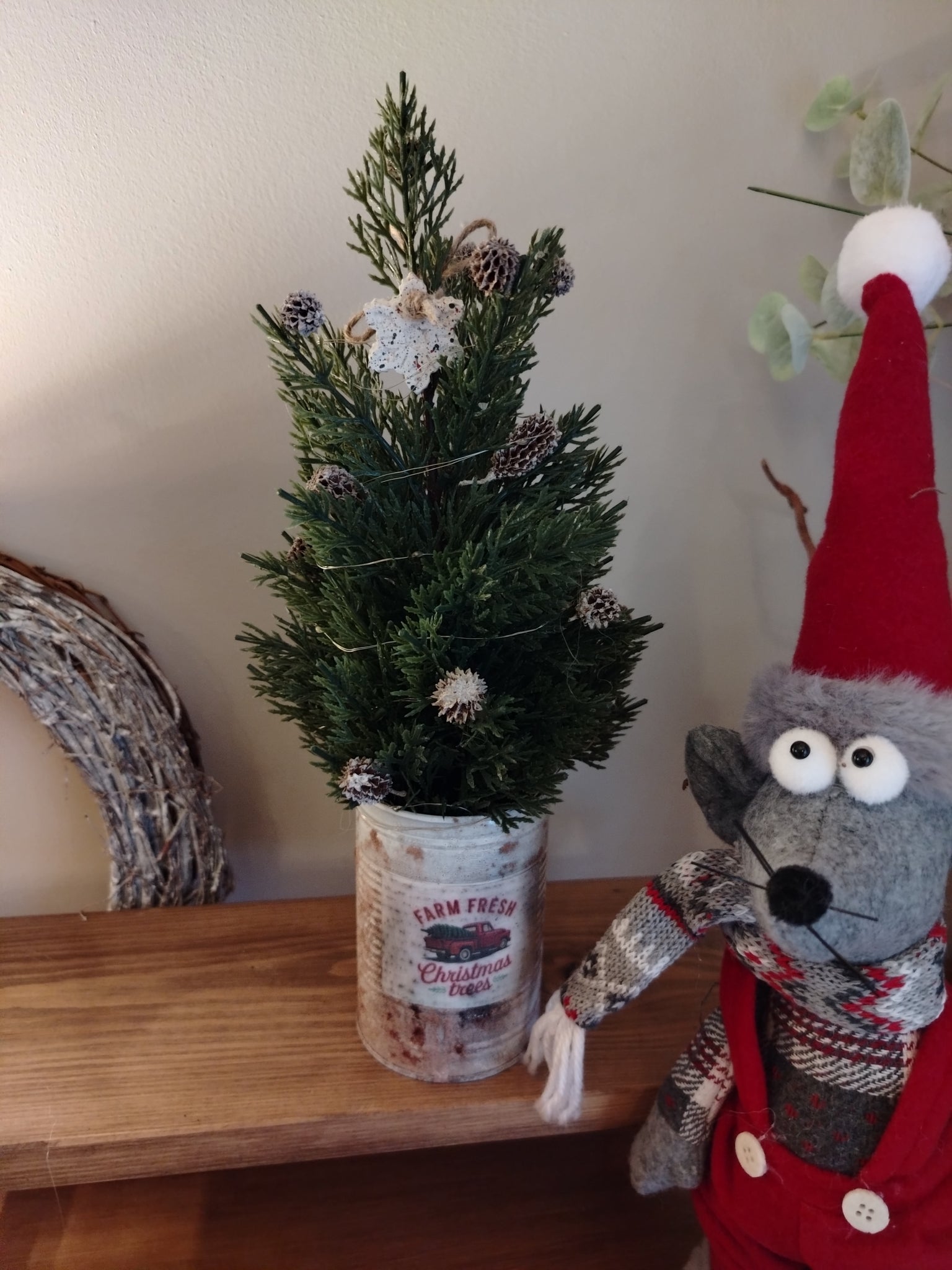 Small Light up Christmas tree in Rustic White tin can pot which has been distressed to give a rusty look.