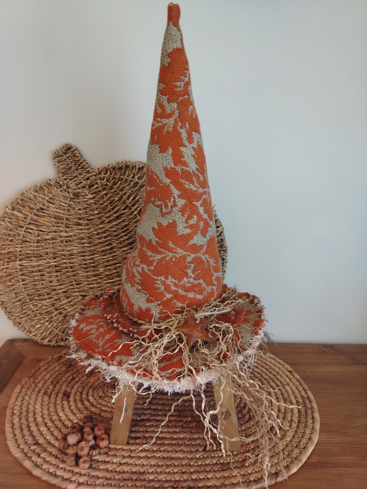 Large handmade rustic orange witches hat with raffia detail and rusty star