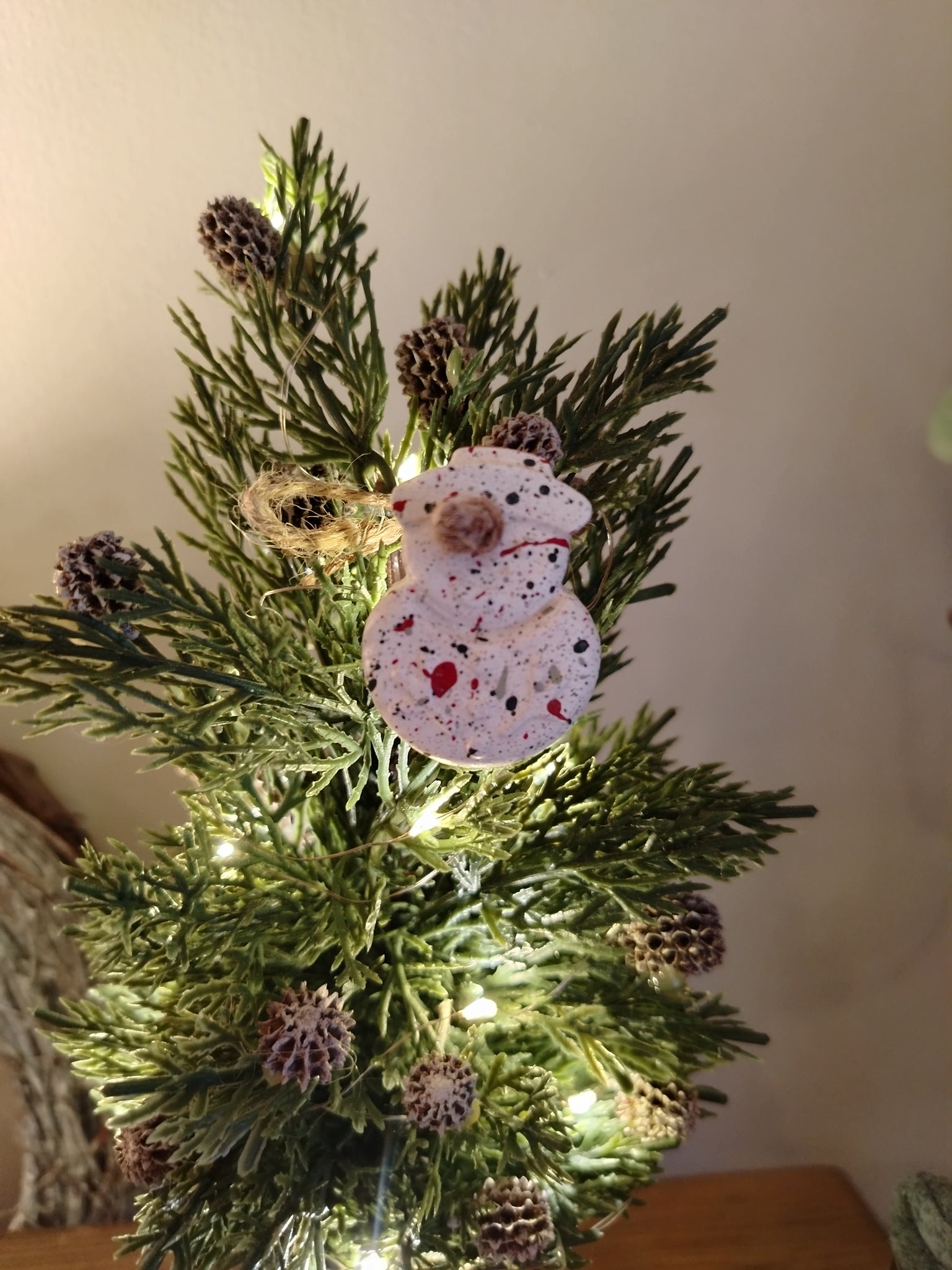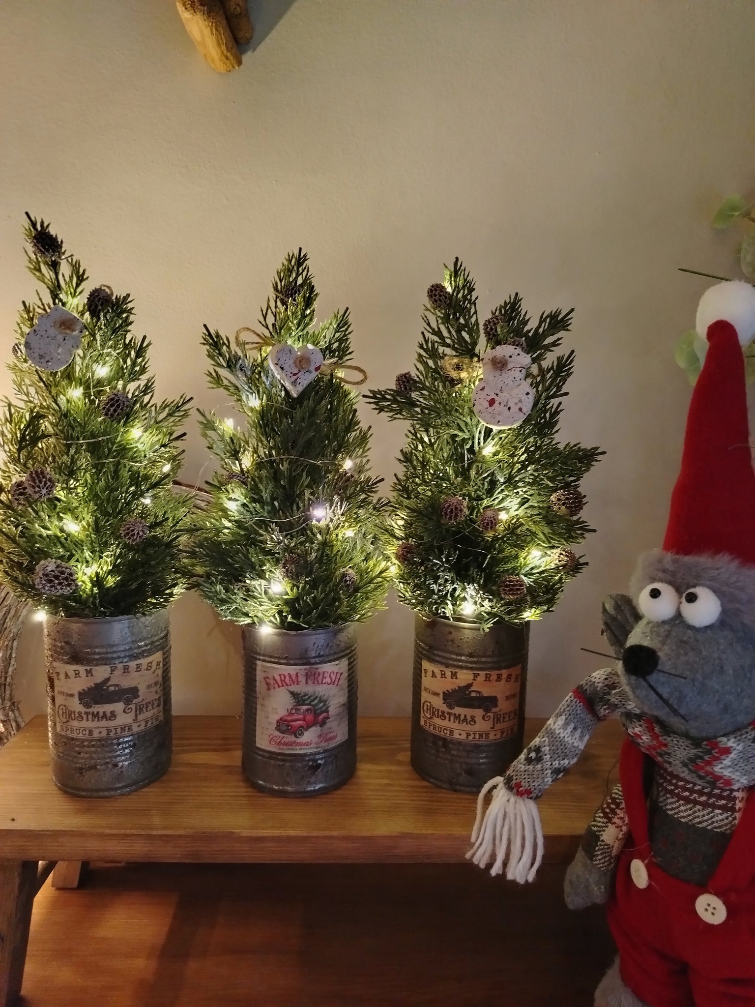 Small Light up Christmas tree in Rustic silver tin can pot which has been distressed to give a rusty look.
