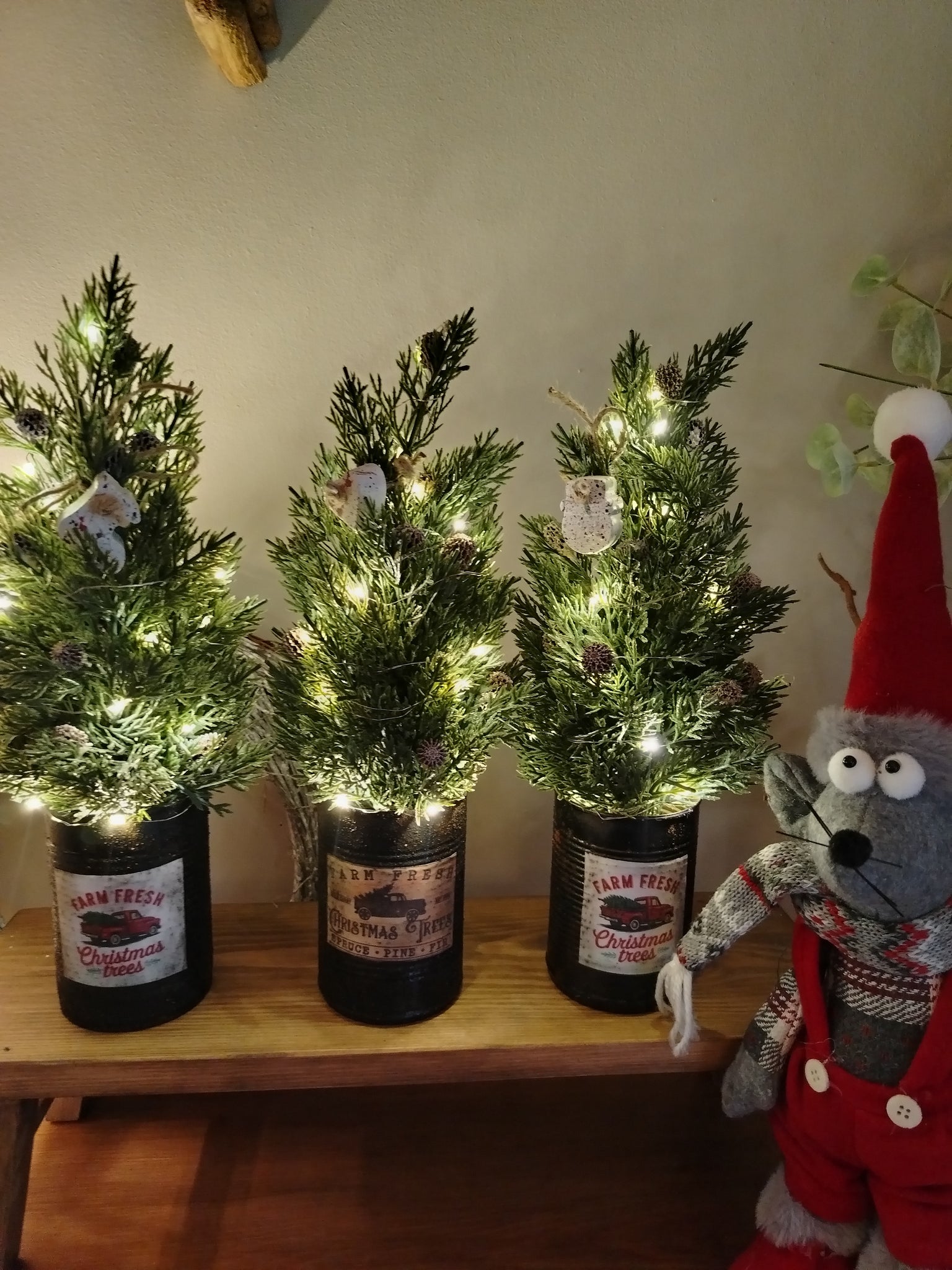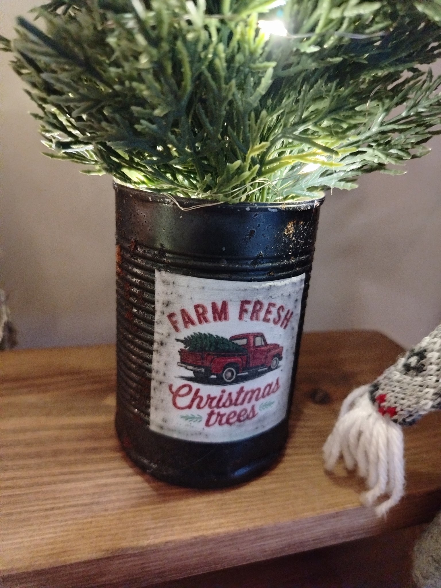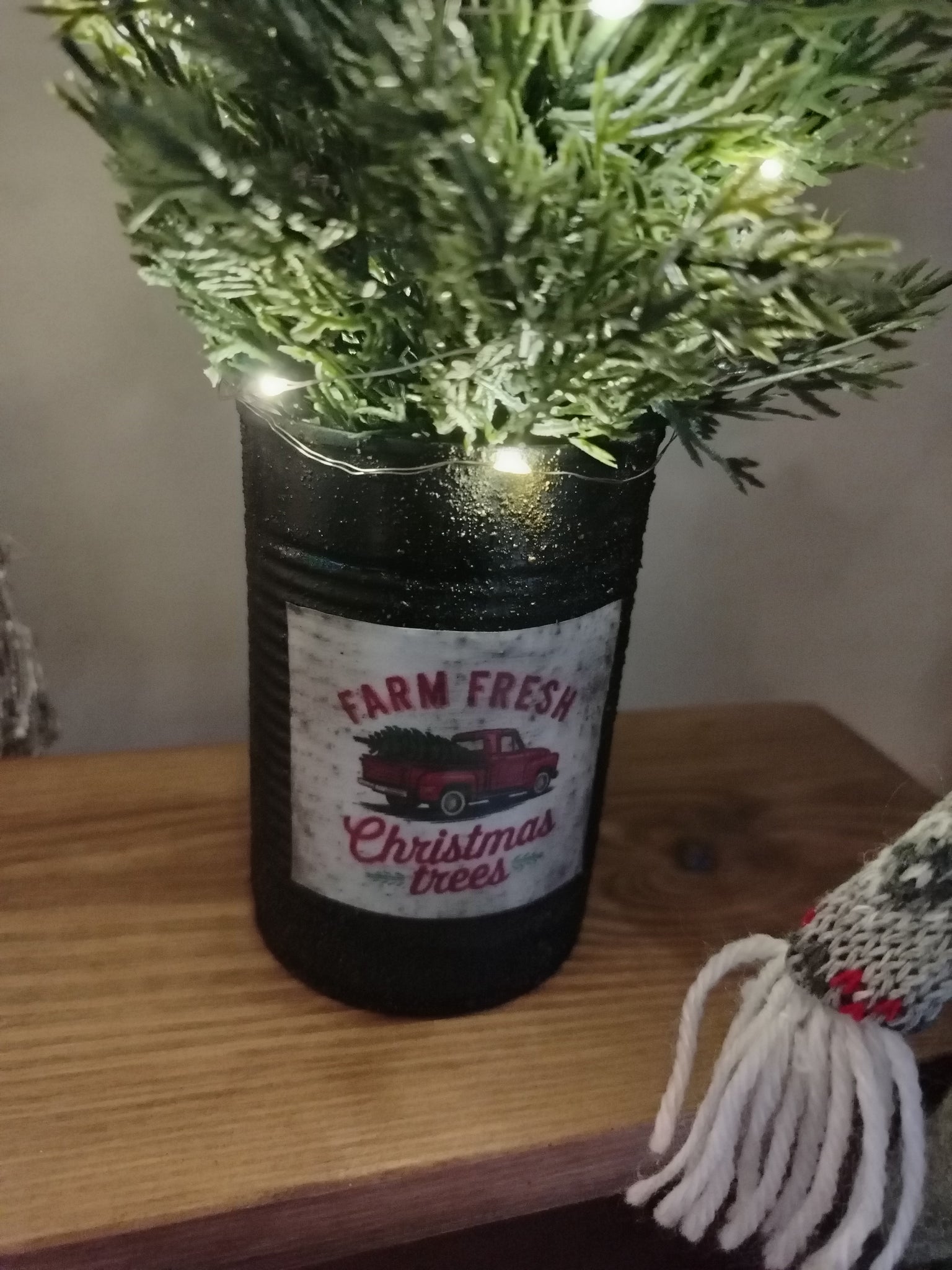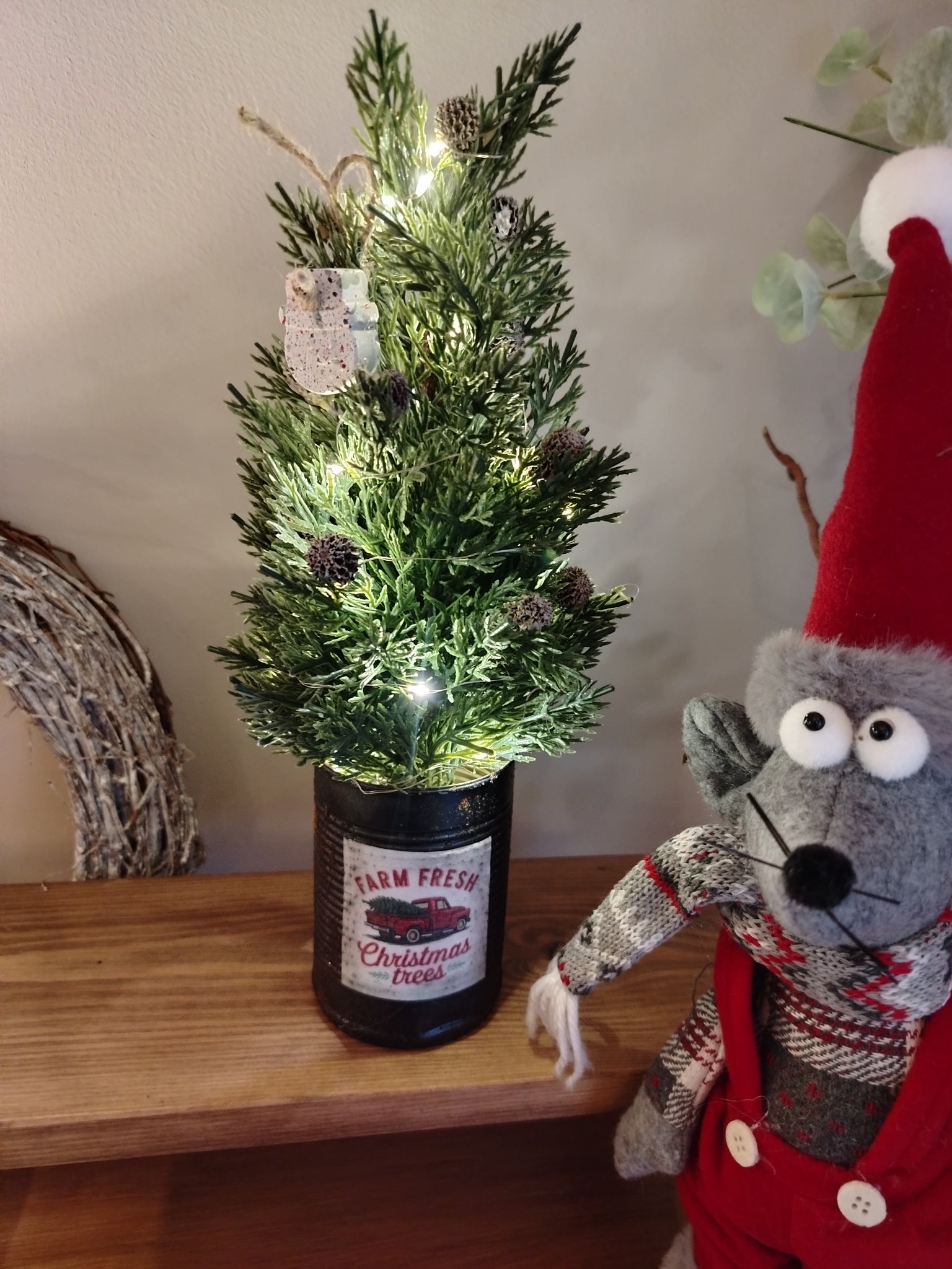 Small Light up Christmas tree in Rustic Black tin can pot which has been distressed to give a rusty look.