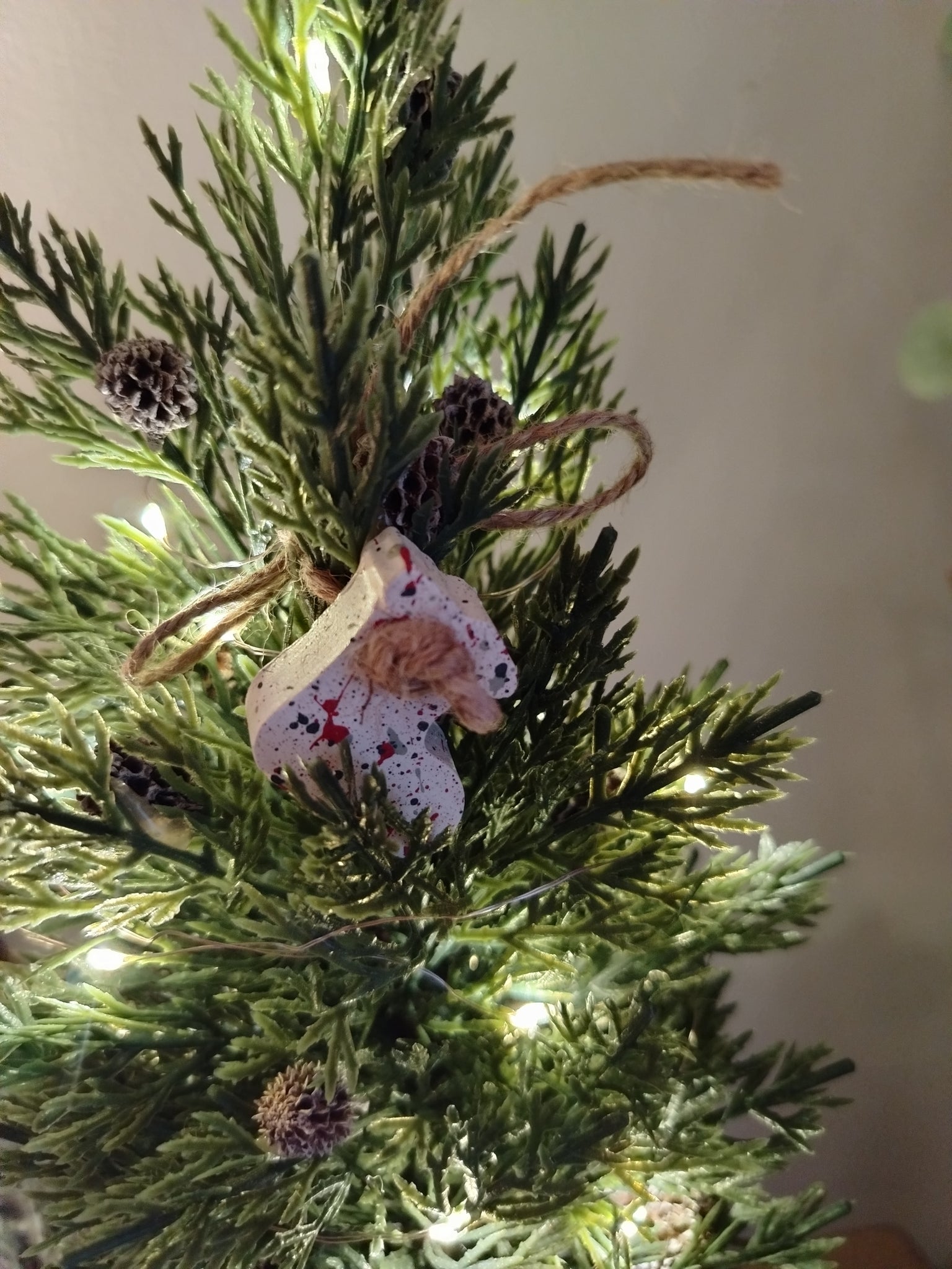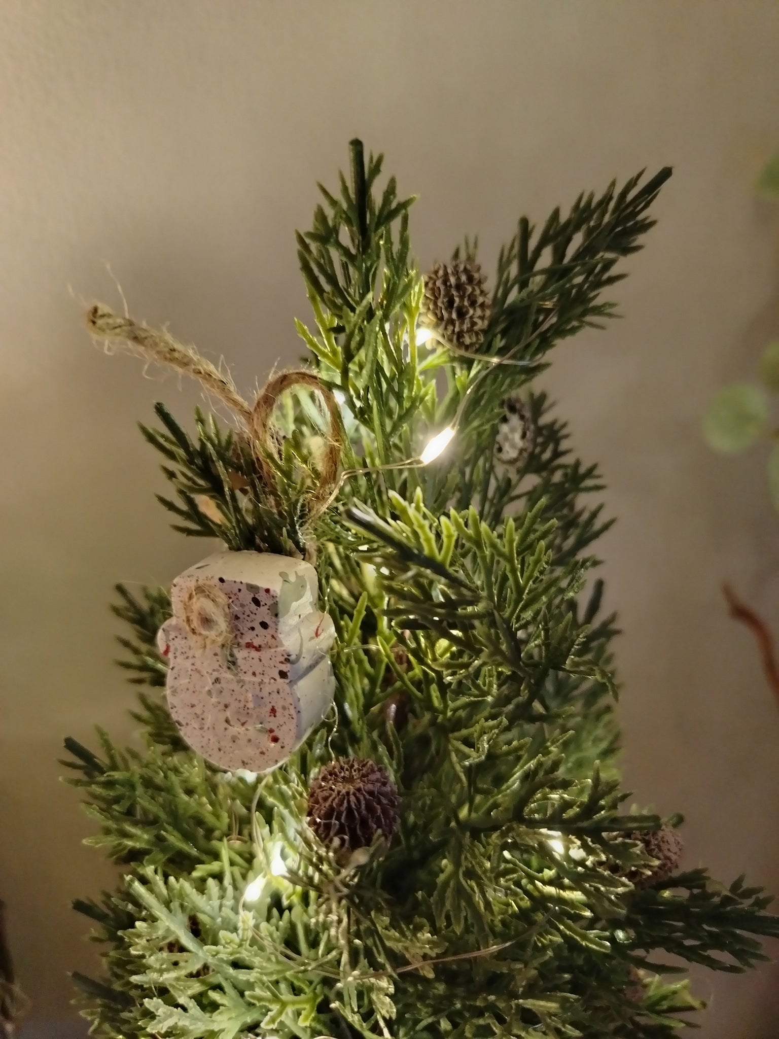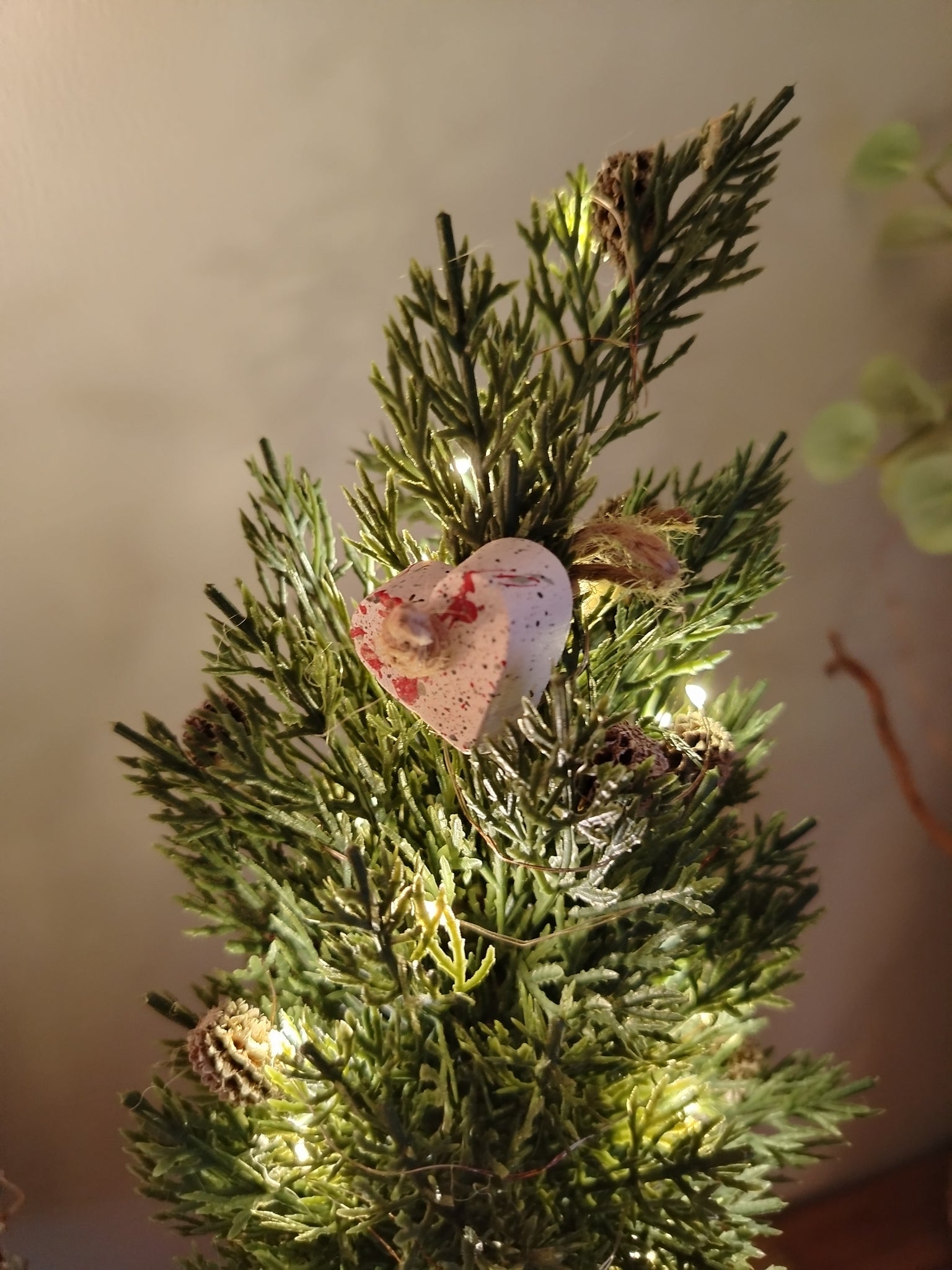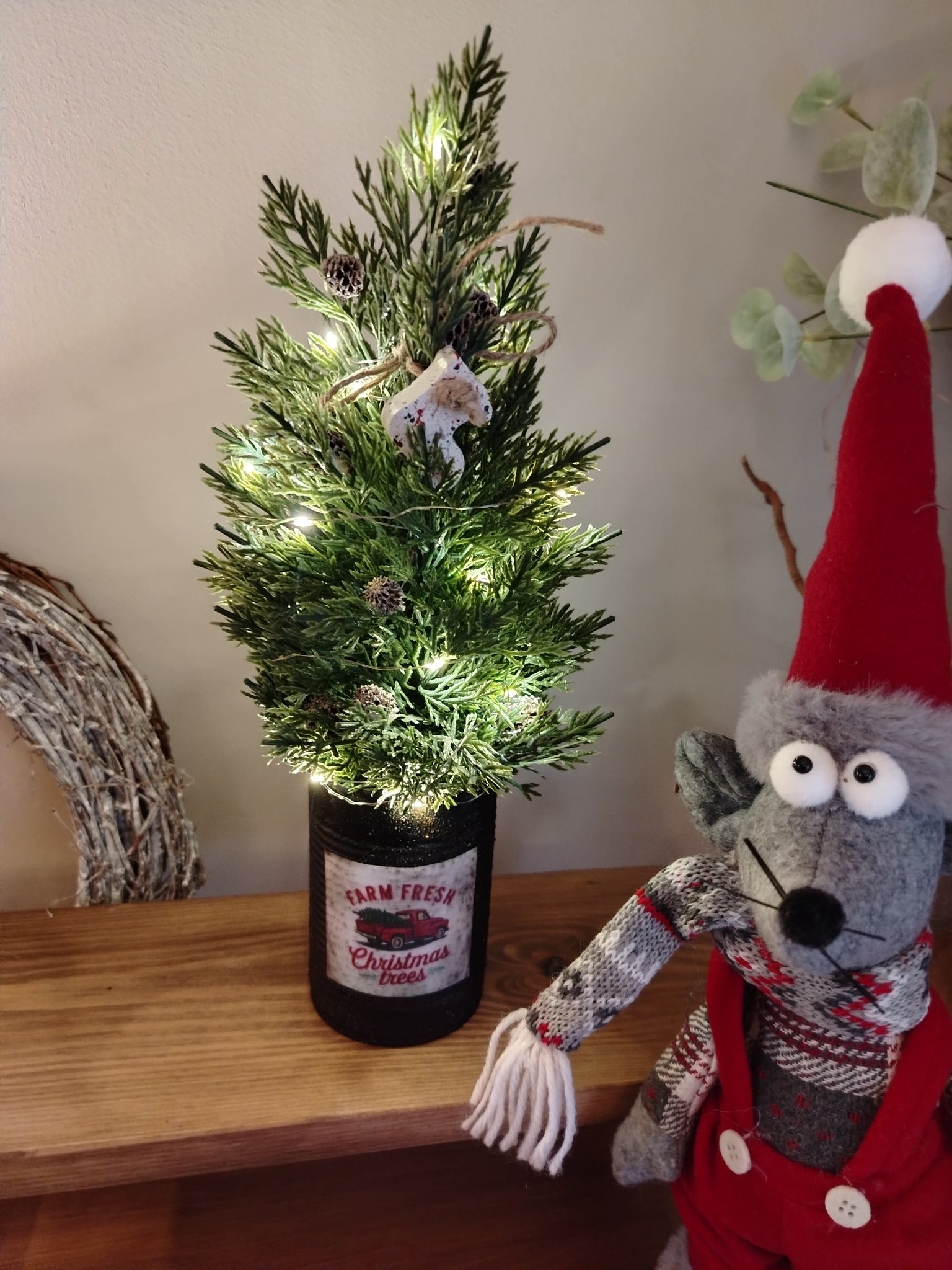 Small Light up Christmas tree in Rustic Black tin can pot which has been distressed to give a rusty look.