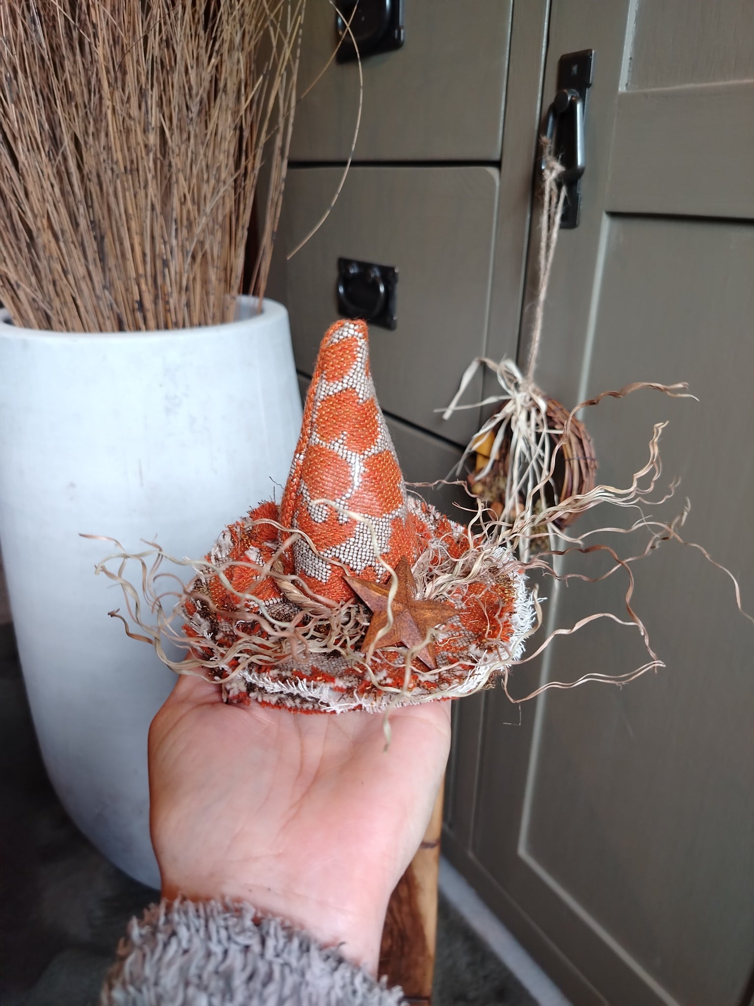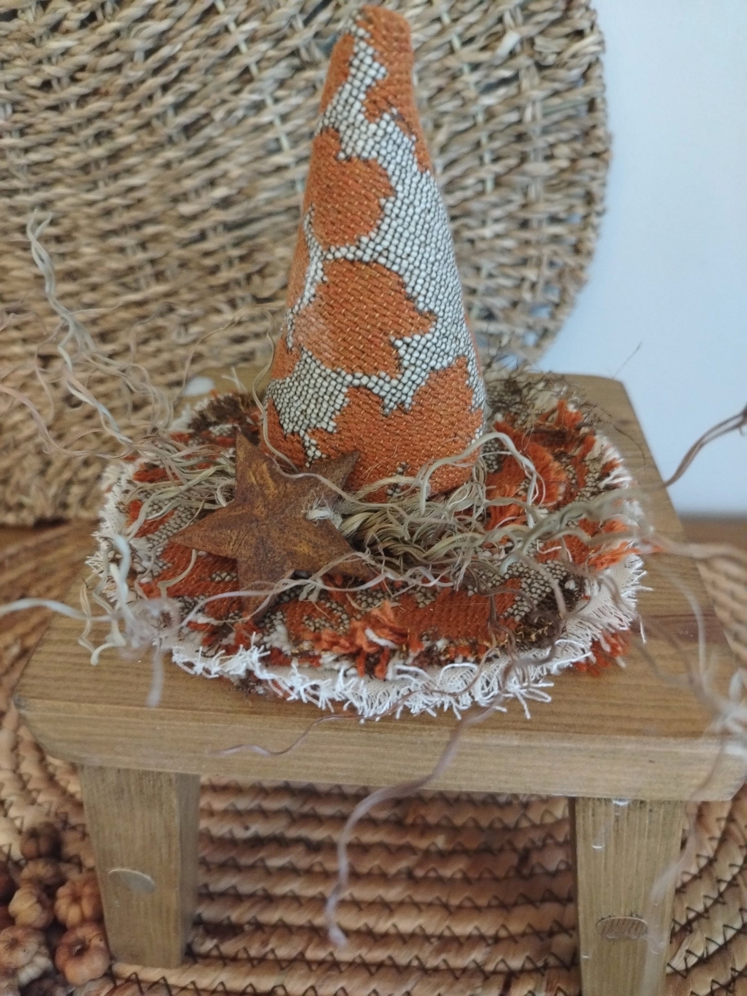 Mini handmade rustic orange witches hat with raffia detail and rusty star
